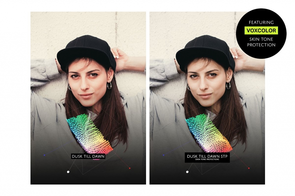 这些预设是增强型VOXCOLOR的肤色保护技术。无需使用Photoshop,即可恢复50%至75%的原始肤色,从而获得专业效果。它适用于深色和浅色肤色。