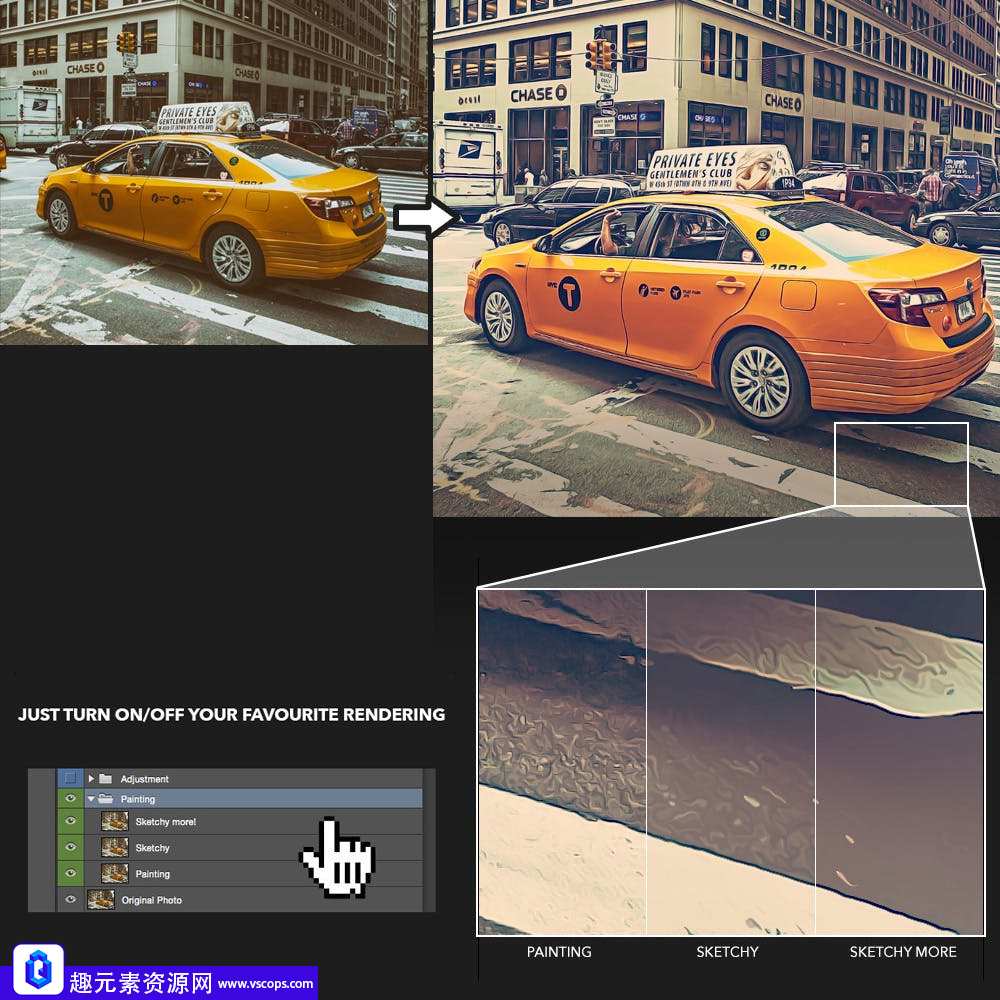 Smart Painting Effect是一个Photoshop插件,可以将您的照片转换为美观逼真的绘画。只需执行动作,看看您的绘图就变得生动起来!